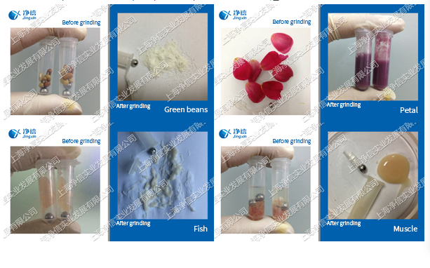 Put the sample and grinding ball into the grinding machine (with grinding jar or centrifuge tube/adapter), under the action of high frequency swing, the grinding ball collides and rubs back and forth in the grinding machine at high speed, and the sample can be completed in a very short time Grinding, crushing, mixing and cell wall breaking.