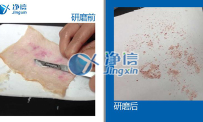 通過研磨脫脂豬皮樣品,對樣品細胞進行提純,研究其藥物作用。破碎過程中脫脂豬皮組織需要在低溫中進行,樣品本身較為堅韌,處理過程比較繁瑣,所以客戶選擇使用上海凈信冷凍研磨儀進行前處理破碎。