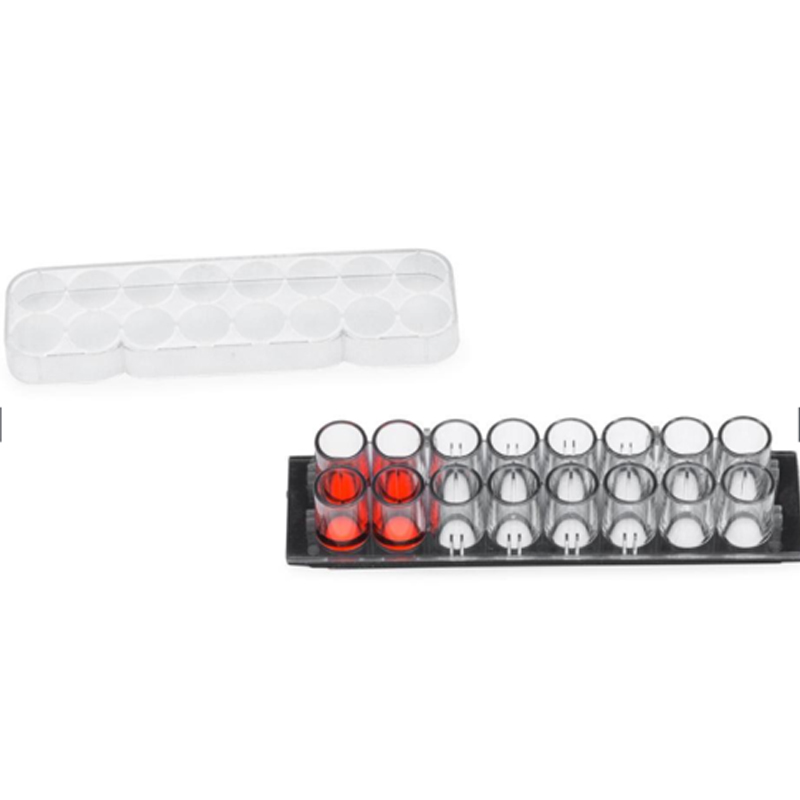 蓋玻片上的腔室共16個(gè),分2排,各8孔(如圖示),每孔的內(nèi)直徑6mm。設(shè)計(jì)的每孔體積和孔距與標(biāo)準(zhǔn)96孔板的相同,無細(xì)胞毒性的硅膠孔墊片(silicone well gasket)與上層聚苯乙烯材料的腔室(the upper structure,厚0.5mm)和基層的硼硅酸鹽蓋玻片(the substructure,厚0.16-.19mm)形成滴水不漏的密封。有上層腔室時(shí)每孔體積250μl,去掉上層腔室后每孔體積9μl。