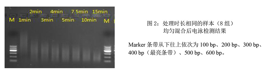 4、相同處理時長的樣本混合后,瓊脂糖凝膠電泳檢測結果: