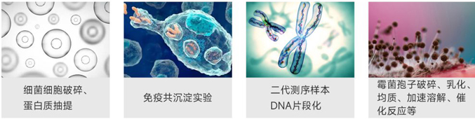 細(xì)菌細(xì)胞破碎、蛋白質(zhì)抽提、免疫共沉淀實驗、二代測序樣本、霉菌孢子破碎/乳化、DNA片段化、均質(zhì)/加速溶解/催化反應(yīng)等